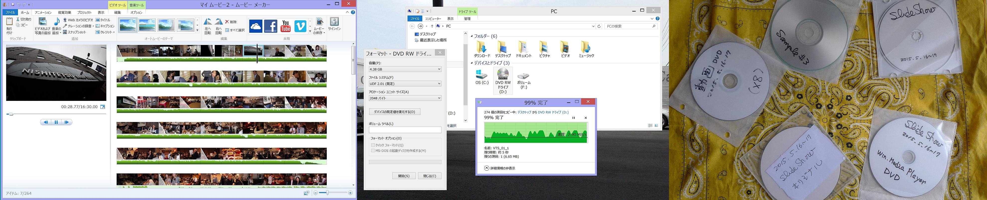 着々と進展しています。PCでの閲覧は即可能なンですが、DVDプレーヤーで再生できる用にするのが一苦労なんですぅ(^^;。(*お互いに、撮って撮られての1枚です。岡ちゃんサンクス。)