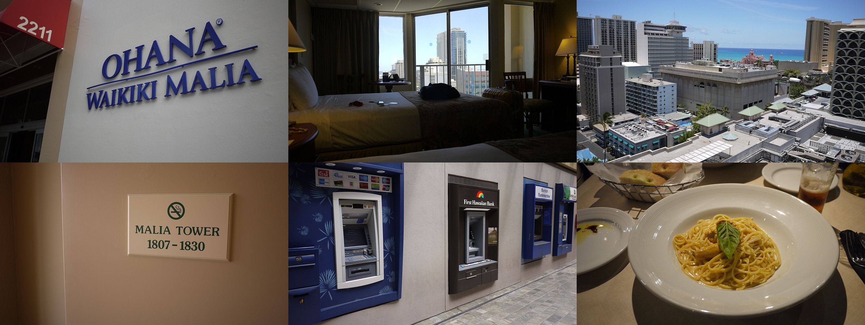 OHANA WAIKIKI Malia HotelCランクですが、清潔で感じの良いホテルです。「上の方の階がいい」と言ったら、チャンと最上階の部屋を用意してくれました(^^♪。クヒオ通りに面して、D.F.S.にも2分くらいです。パスタは、純ちゃんお勧めの絶品「うにクリームパスタ」です。